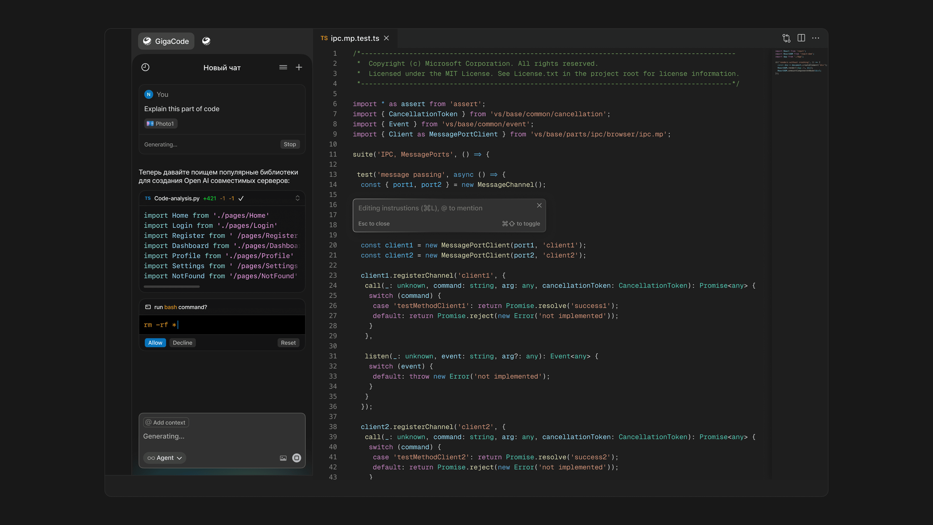 We launched Agent Mode in GigaCode to embed autonomous AI agents directly into the developer’s workspace. These agents understand project context, refactor code, and carry out complex, multi-step tasks in parallel with the developer